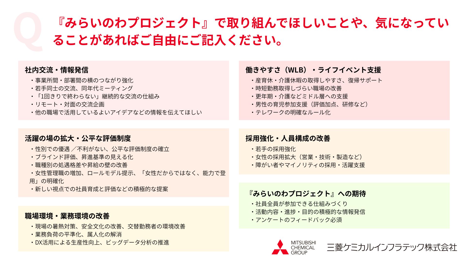 三菱ケミカルインフラテック(以下、当社)では、従業員一人ひとりが力を発揮し、変化の大きい時代でも価値を生み出し続けるために、多様性を活かした組織づくりに取り組んでいます。その取り組みの一つとして立ち上がったのが、女性活躍推進を起点とした『みらいのわプロジェクト』です。