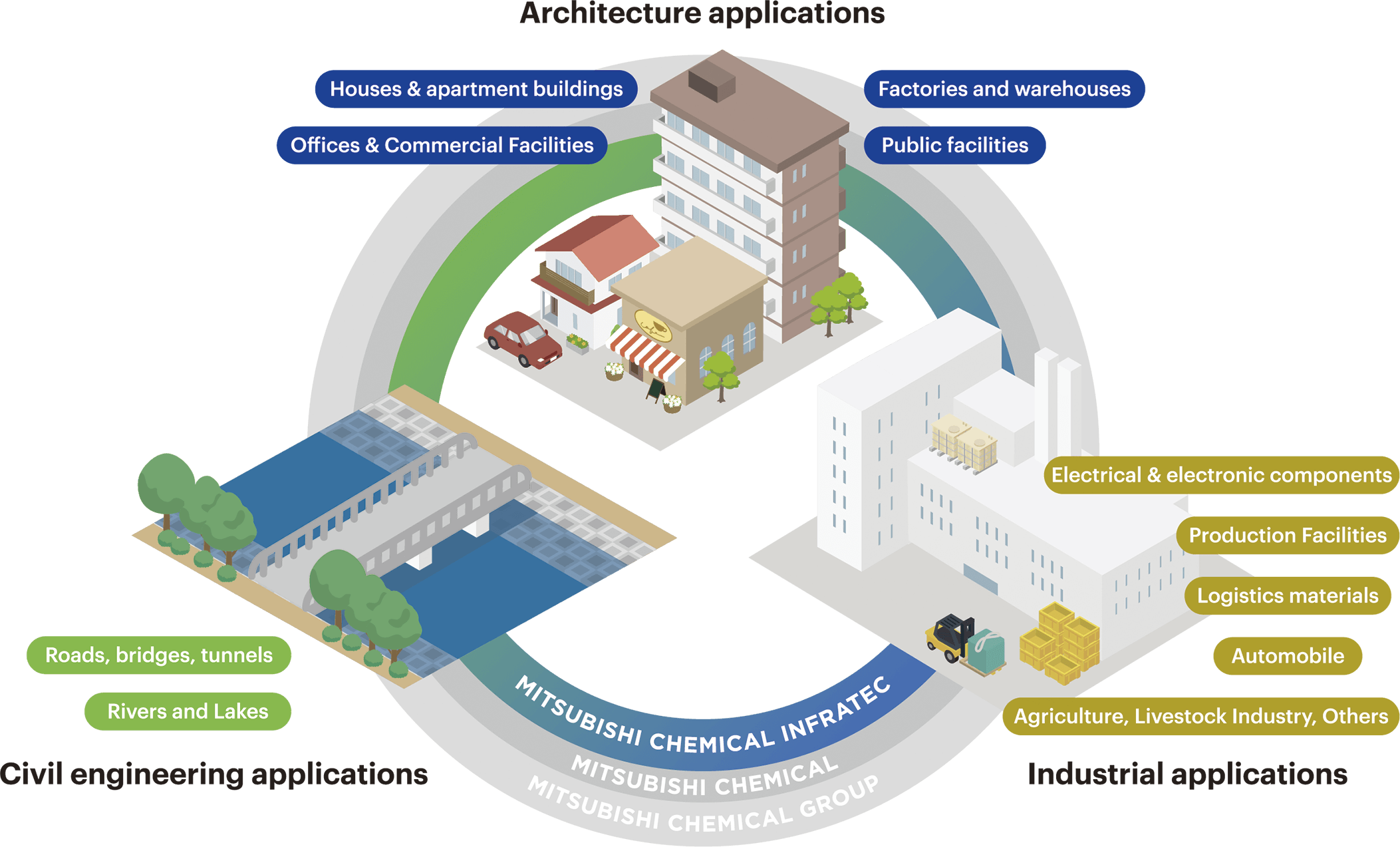 Since its establishment in 2013, Mitsubishi Chemical Infratec Co.,Ltd. has expanded its business activities by providing products and services in a wide range of fields that support society and the foundations of daily life, including construction, civil engineering, industrial materials, housing equipment, and infrastructure.