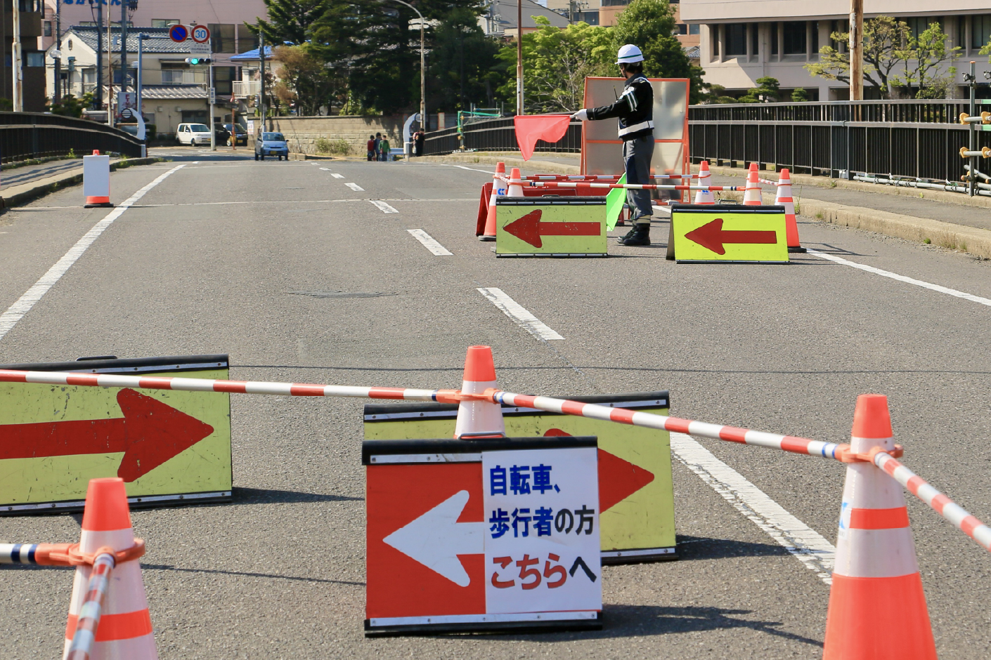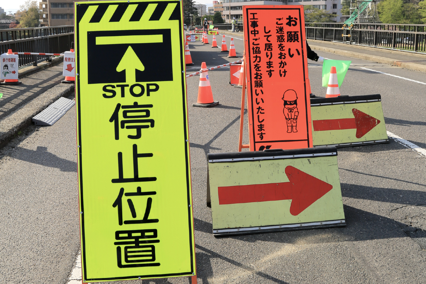 工事現場の看板は、安全確保と誘導のための大切なサイン。道路や橋を守る作業の裏側を静かに支えています。